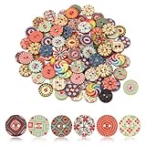 - Botones decorativos: 100 piezas de botones de madera vintage con diversos diseños, ideales para manualidades y costura. Cada botón cuenta con pintura floral y 2 agujeros para facilitar su cosido