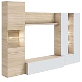 - El conjunto de muebles están fabricados en melamina de color blanco brillo y roble canadian. Está compuesto por un módulo bajo de televisión, dos vitrinas con estantes de cristal y luces led y un...